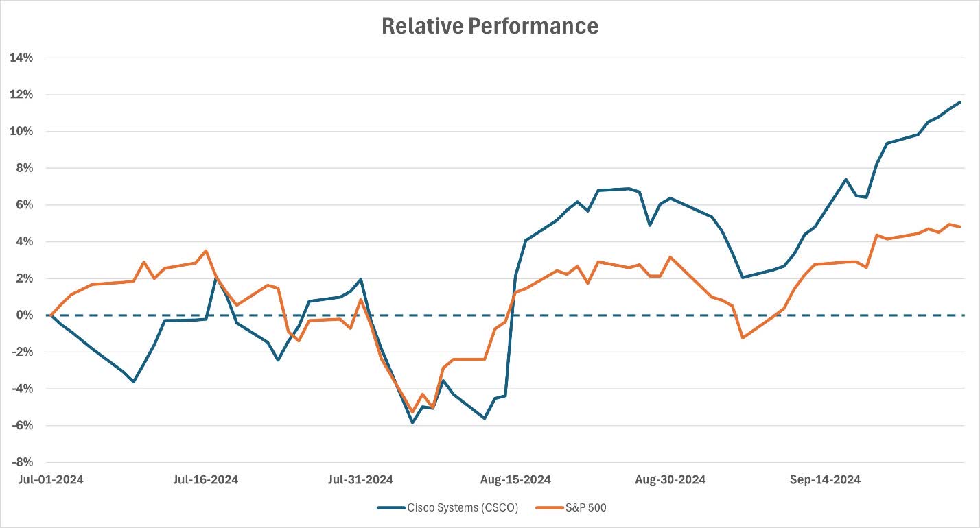 I initiated coverage on Cisco on July 1st with a “Hold” rating. Since then, the stock has outperformed the broader S&P 500 index. The stock was up 11.6% (12.6% including dividends), while the S&P 500 was up 4.8%.
