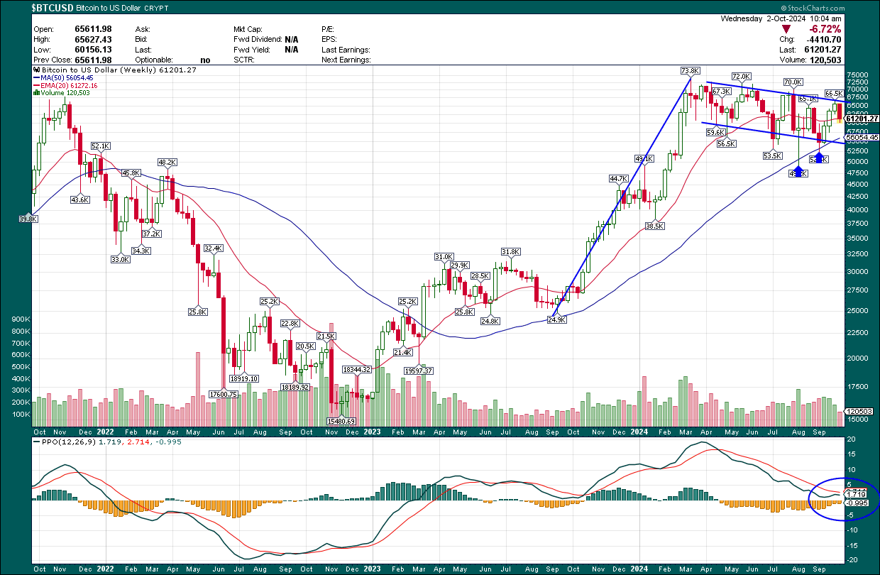 This is a three-year weekly chart, and we can see some very bullish developments. I see a bull flag that has formed, which is comprised of the “pole” from summer of 2023 to the peak in spring of 2024, as well as the “flag” that has formed in the channel I’ve drawn above. A bull flag is a continuation pattern, so as long as the flag doesn’t break to the downside, we should plan on seeing higher prices in the months to come.