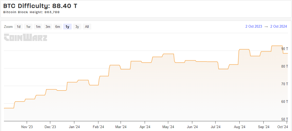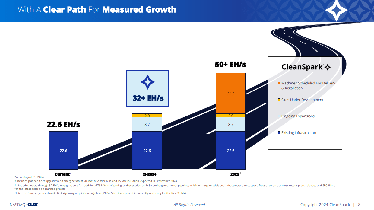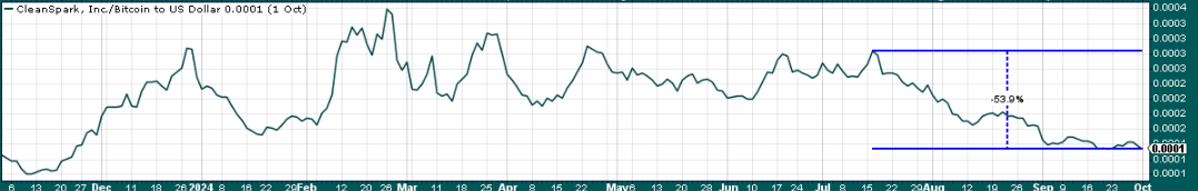 This is a one-year chart, and we can see that – on the bright side for miners – difficulty has been stable since the halving in April. It climbed significantly into that event, however, so year-on-year, mining is still much more difficult than it was. That is the long-term trend, of course, so adding capacity simply helps to offset this rising difficulty. However, CleanSpark is adding capacity quickly enough it can both overcome this rising difficulty, and mine more Bitcoin over time. Its competitive positioning from a scale perspective against the other miners makes it attractive, in my view.