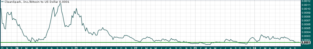Finally, on the valuation front, this is the same chart of CleanSpark’s share price against that of Bitcoin, but for five years to give us a long-term perspective.