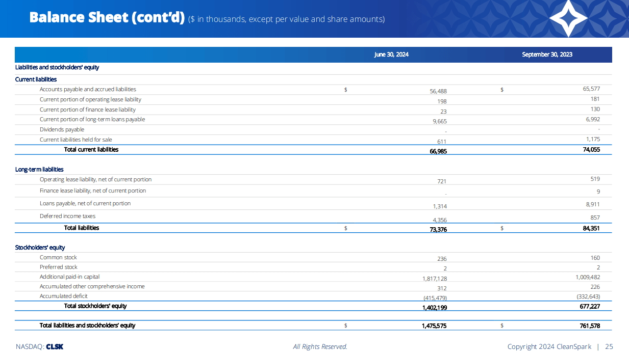 This slide is a bit of an eye chart, but the important bits are the stockholders’ equity (~$1.4 billion) and basically non-existent long-term liabilities. CleanSpark’s balance sheet really couldn’t look much better, so it has little to no financing risk. With some miners/owners of Bitcoin using significant leverage, CleanSpark stands apart in this way.