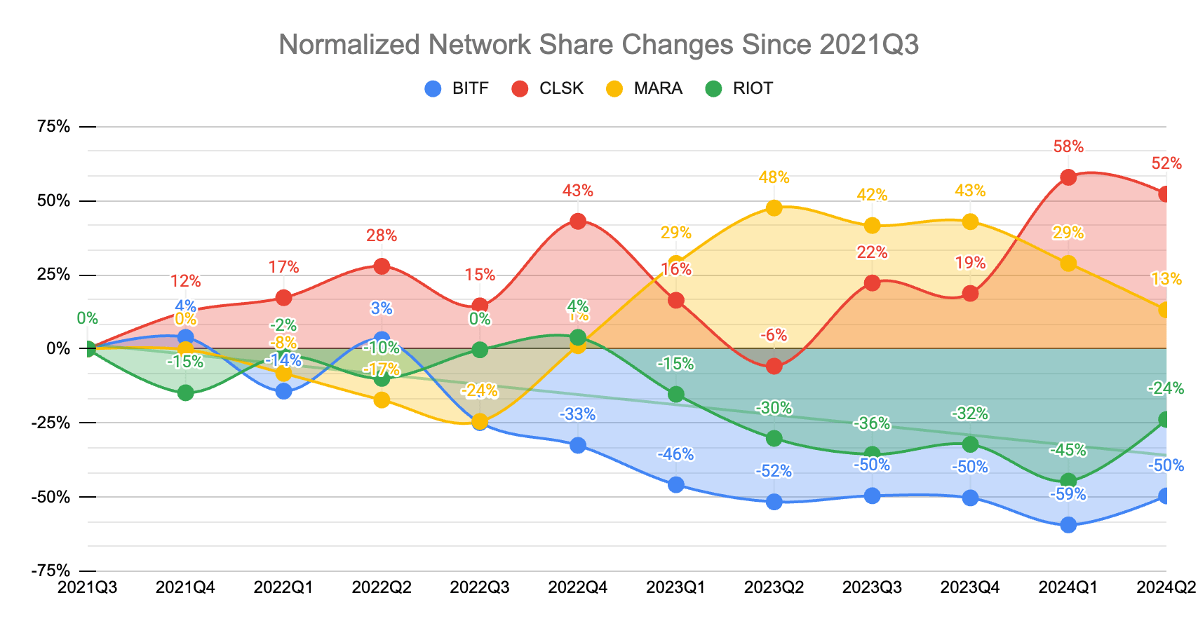 Fig 1. Normalized Bitcoin Network Share Changes Since 2021Q3 (BITF, CLSK, MARA, RIOT) (Author)