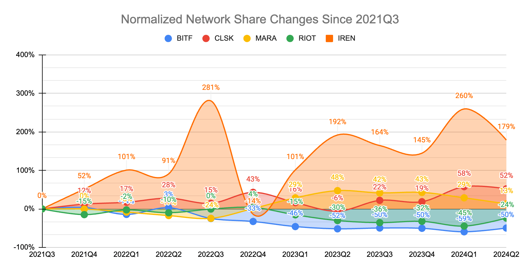Fig 3. Normalized Bitcoin Network Share Changes Since 2021Q3 (BITF, CLSK, IREN, MARA, RIOT) (Author)