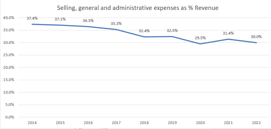 Lastly, Coca-Cola is actively incorporating AI into its digital platforms. As highlighted in their earnings call, the utilization of generative AI enhances their access to insights, market data, research, and trends. Consequently, their SG&A expenses to revenue ratio has been on a declining trend over the past few years. This improvement has played a pivotal role in facilitating margin expansion.