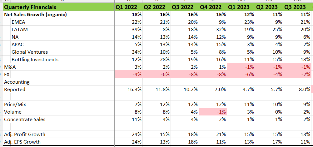 They delivered a robust Q3 FY23 result, with a remarkable 11% organic revenue growth. The price/mix contributed an impressive 9% year-over-year growth for Coca-Cola. Adjusted profit grew by 13%, and EPS was up by 11%.