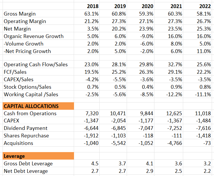 The table below examines their financial results over the past five years, revealing accelerated growth in recent years driven by strong price/mix and volume growth. Their cash flow conversion is robust, and they allocate most capital to dividend payouts, acquisitions, and some share repurchases to offset SBC dilutions.