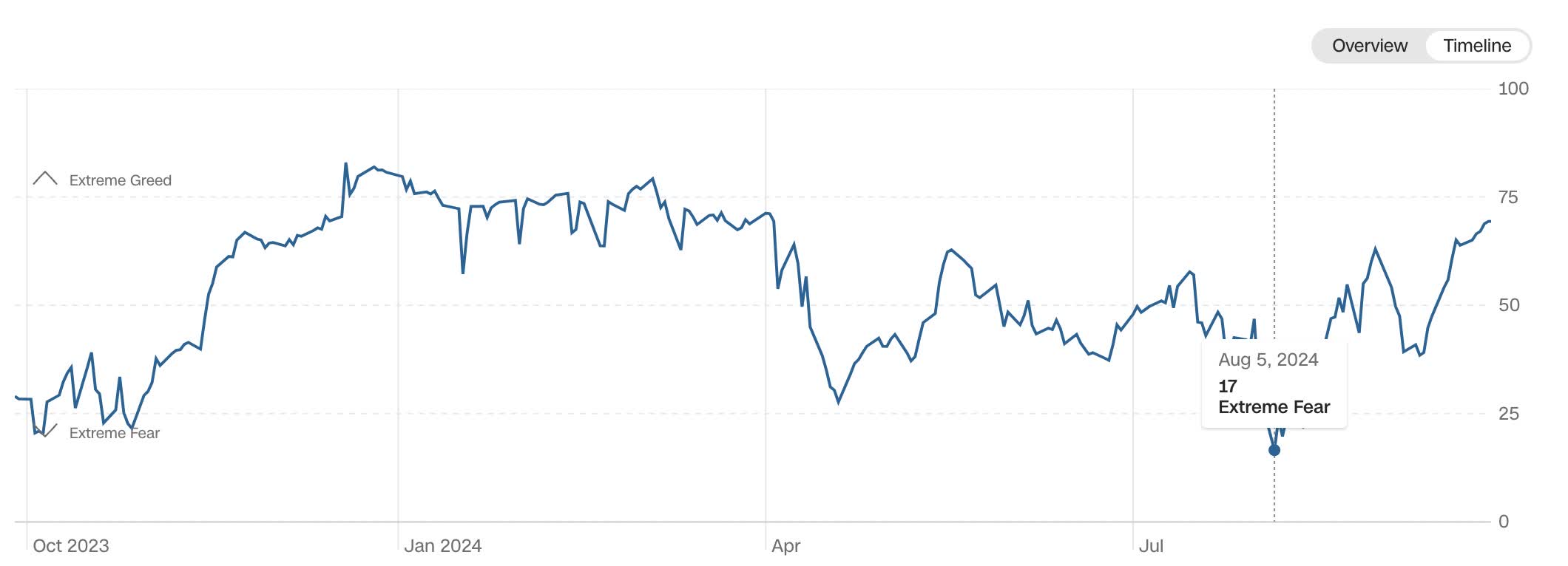 Coca-Cola (NYSE:KO) stock has performed extraordinarily well throughout this year, as it has attracted investors because of its defensive characteristics in the midst of a market still fearful of a recession. The company also proven resilient with strong quarterly results even with weak consumer spending trends. Although over the course of September, fear in the markets dissipated somewhat, if we look at the Fear & Greed index over the course of this year, there have been periods of extreme fear in the markets in recent months.