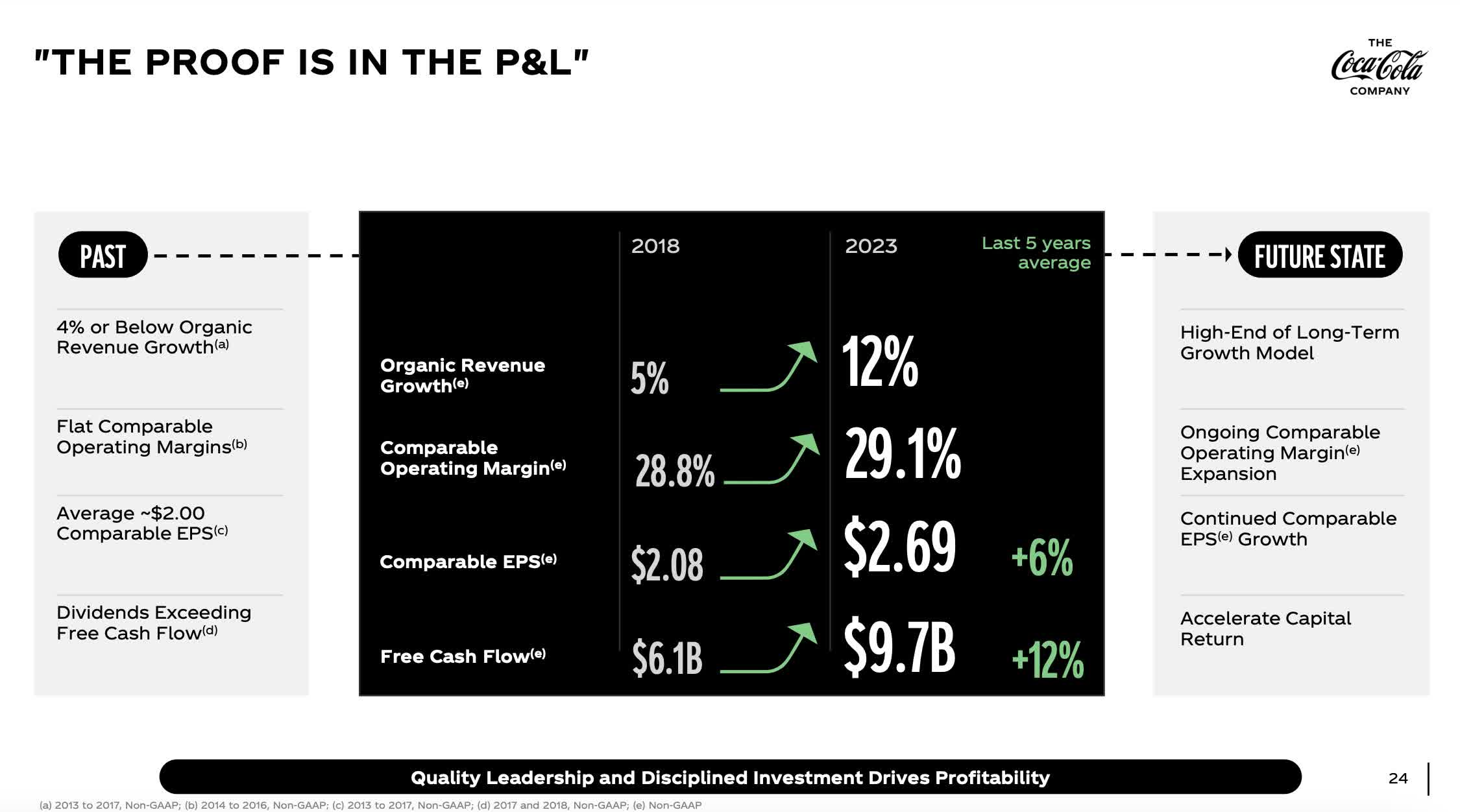 Bringing up some data from Coca-Cola’s most recent investor presentation, I’d like to draw attention to where the company has placed itself in the past and where it projects its future.