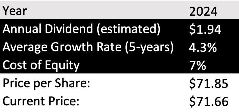 To further support this view, I highlight the dividend-based valuation model. This values the company based on how much they are paying out in dividends and how much that dividend is increasing over time, where I divide the value of the next year’s annual dividend, in this case using $1.94, by the cost of capital (8%), decreased by the growth in perpetuity (3%). When we put into the equation the average dividend growth rate over the past few years is around 4.3%. If the company can achieve 4% dividend growth moving forward with a discount rate of 7%, we come to a dividend discount model price per share of $71.85. This suggests that Coca-Cola appears to be fairly valued.