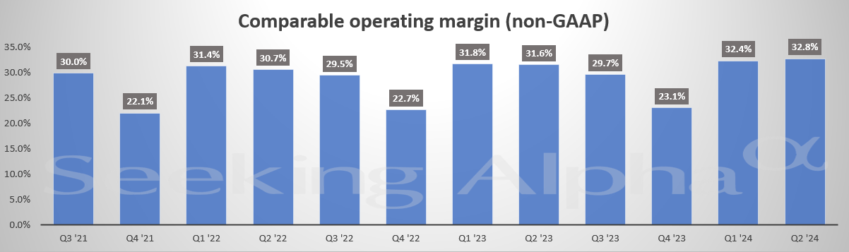 Operating margin (on a non-GAAP basis) dialed in at 32.8% (versus 31.6% a year ago). The next chart better contextualizes the performance. As seen, this level of operating margin is the highest in at least the past 3 years. Management attributed such expansion to strong business performance and the impact of refranchising bottling operations.