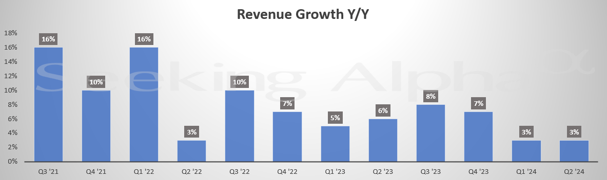 Now, the less positive news. My overall takeaway is that growth remained challenged and uneven across different markets. The top growth drivers, unsurprisingly, were the Latin America market (+28%) and the EMEA (+30%). However, bear in mind that these also happen to be markets experiencing intense inflation, on top of the overall backdrop of above-average inflation in most of its markets. Thus, pricing actions played a significant role in offsetting shipping volume fluctuations. For example, in North America, unit case volume declined by 1%. All told, revenue growth was 3% YOY, among the bottom level in the past 3 years as seen in the chart below.