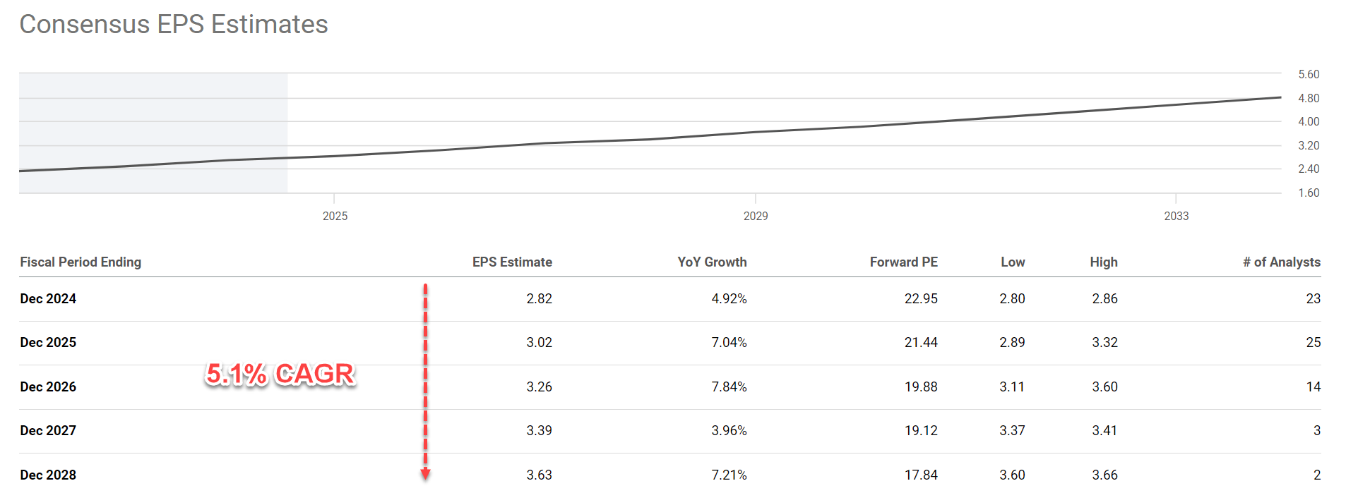 I expect the bottom-line growth to be slightly better, thanks to the expanded margin mentioned above and also share repurchases. Indeed, consensus EPS estimates point to an EPS growth rate of 5.1% (in terms of compound annual growth rate, CAGR) for the next five years as shown in the next chart.