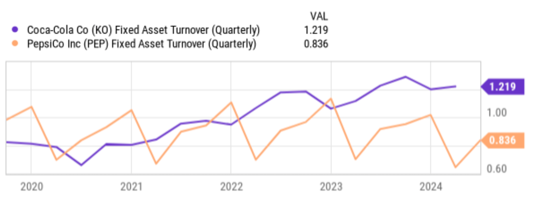 Broadening the context even more, the second chart below shows that KO’s business operations and refranchising efforts are indeed effective, both in comparison with its past performance and also in comparison against its old rival PepsiCo (PEP). To wit, the top panel compares their fixed asset turnover rates, and the bottom panel their operating margin. Fixed asset turnover is a measure of a company’s efficiency in using its fixed assets to generate sales. It is a key return driver in the DuPont Framework (with the other two being leverage and net profit margin). As seen, KO’s current asset turnover rate is indeed near a multi-year peak and definitively above PEP’s.