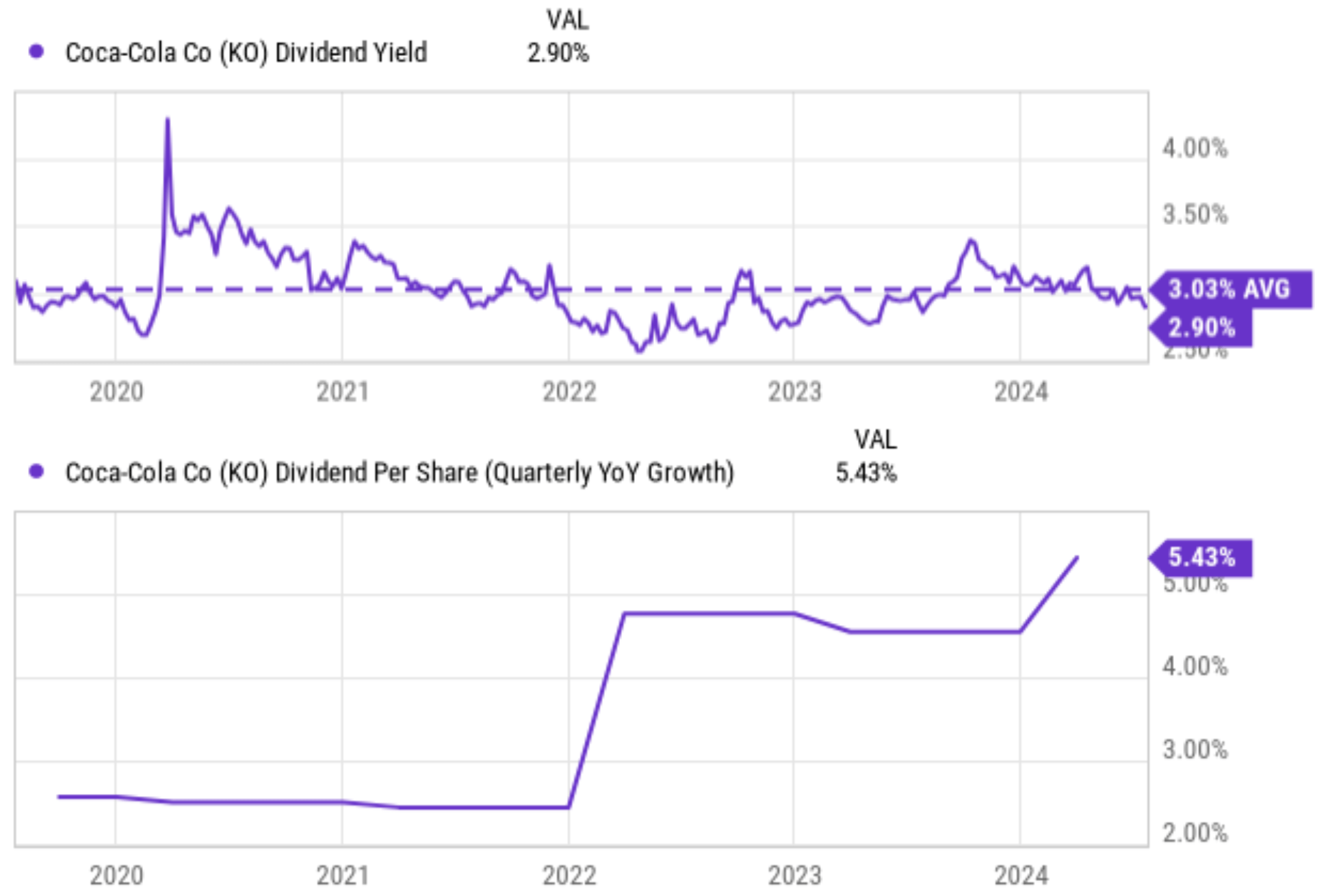 Given its dividend king status, the above valuation premium and limited growth are best reflected in its dividends in my view. More specifically, the chart below shows KO’s dividend yield (top panel) and dividend per share growth (bottom panel) in the past 5 years. As seen, the current dividend yield of 2.9% is slightly below the 5-year average of 3.03%, an indication of a valuation premium. Dividend per share has been growing at about 2.5% only between 2020 and 2022. The rates have accelerated to about 5% on average in the past ~2 years, consistent with the above EPS projection of around 5%.