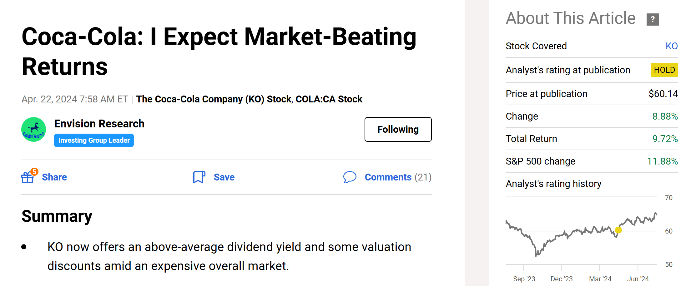I last covered The Coca-Cola Company (NYSE:KO) about 3 months ago, as illustrated by the chart below. The article was titled “I Expect Market-Beating Returns” and was published on Seeking Alpha on April 22, 2024. More specifically, I made the following arguments: