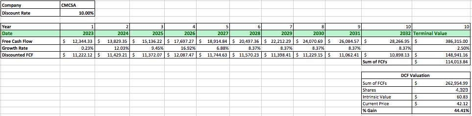 For the subsequent period, we will use a growth rate of 8.37% for years 6-10 based on the average compound annual growth rate of CMCSA’s revenue and free cash flow over the last decade. Employing a discount rate of 10%, based on the average return of the S&P 500 with dividends reinvested, and a conservative perpetual growth rate of 2.5%, we determine the intrinsic value of CMCSA to be $60.83. This suggests that CMCSA may be currently undervalued, presenting investors with a potential return of 44.41% compared to the company’s current market price.