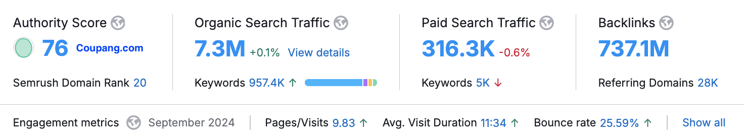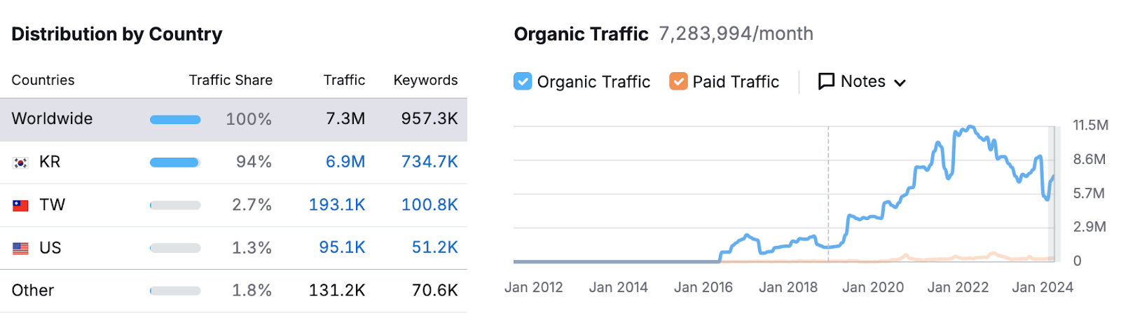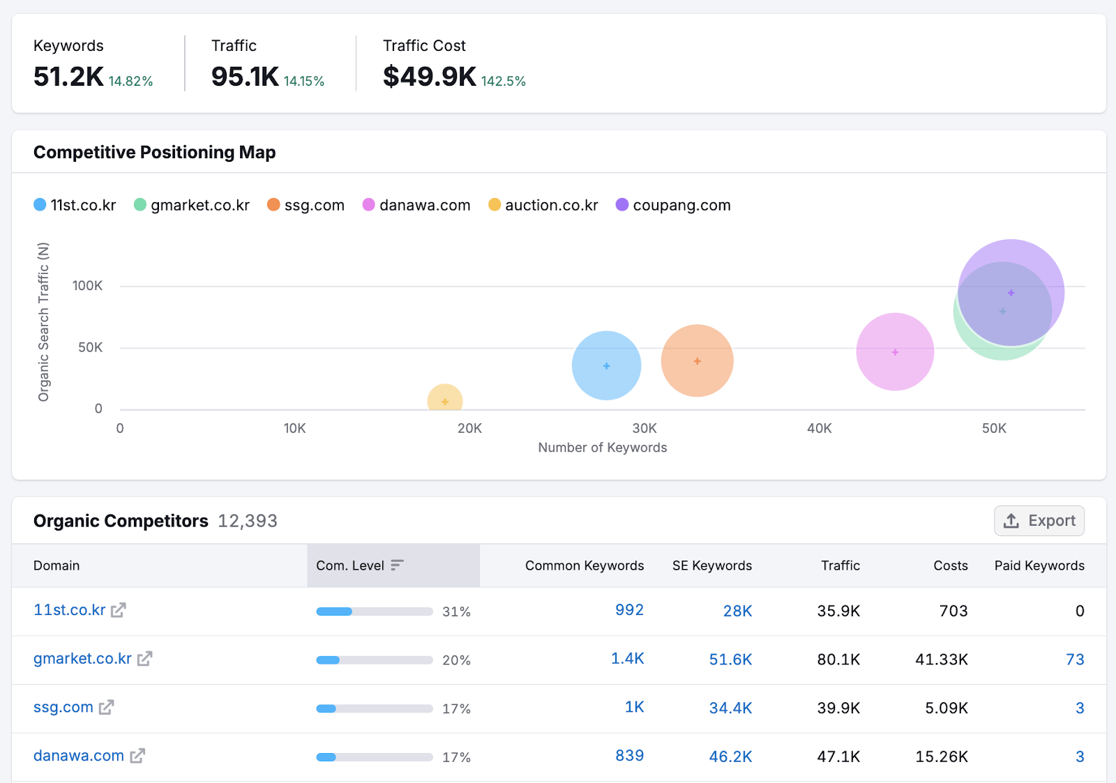 According to Semrush, Coupang leads the organic and search traffic/SEO in South Korea.