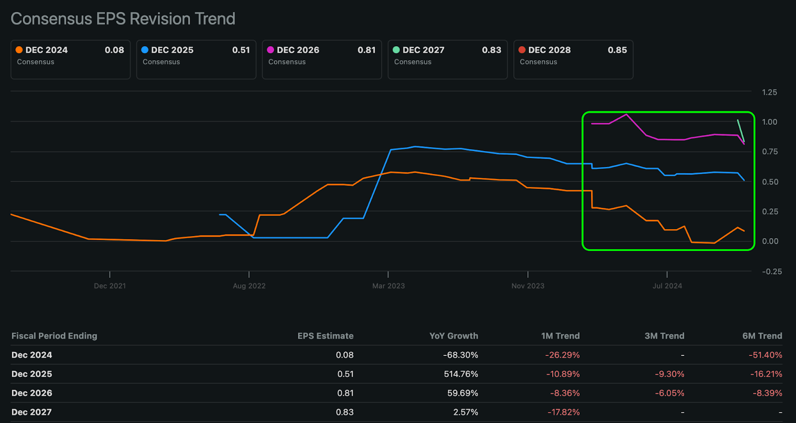 On the other hand, the acquisition of Farfetch in 4Q23 has dragged the company’s margins and profitability in 2024 with several downward EPS revisions over the last quarters. With a muted luxury goods market and uncertainty clouding Farfetch, Coupang stock relies on the performance of its recent acquisition in the short to medium term.