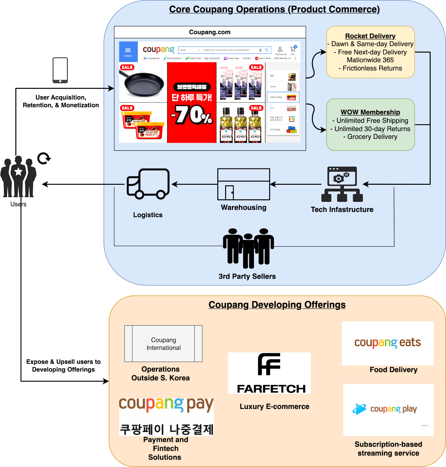 Product Commerce: Coupang operates primarily as an e-commerce or “next-generation retail” company with an online platform and extensive warehouse and logistics capabilities.