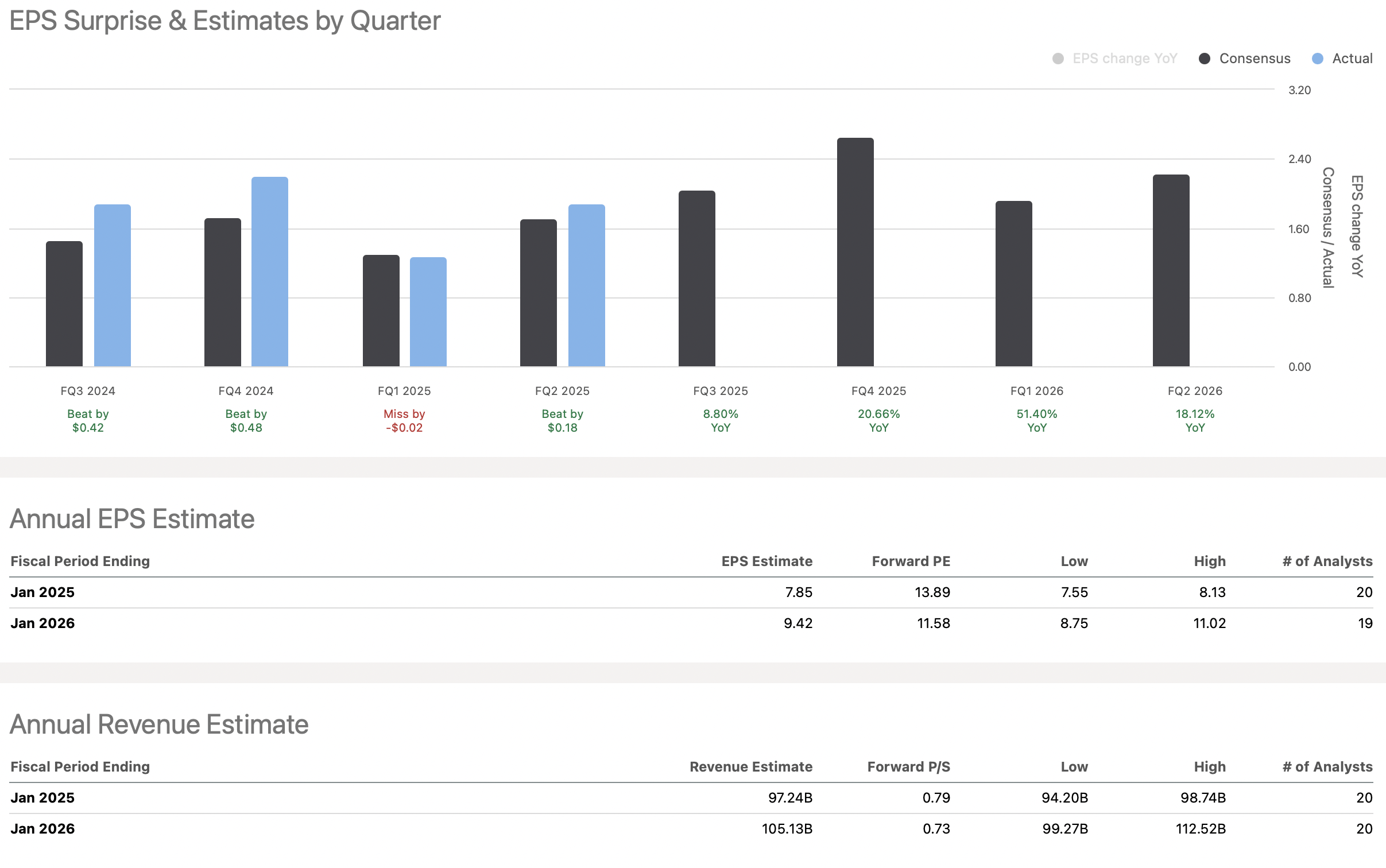 Dell has also done a solid job surpassing most earnings estimates recently. For instance, Dell’s TTM consensus EPS estimate was $6.18, but Dell earned $7.24 instead, a considerable 17.5% outperformance. Due to the bullish dynamic, Dell could continue outperforming, and a modest 10-15% outperformance rate implies Dell could earn around $10-40-$10.80 next year, potentially pointing to a sub-10 forward P/E multiple for Dell.