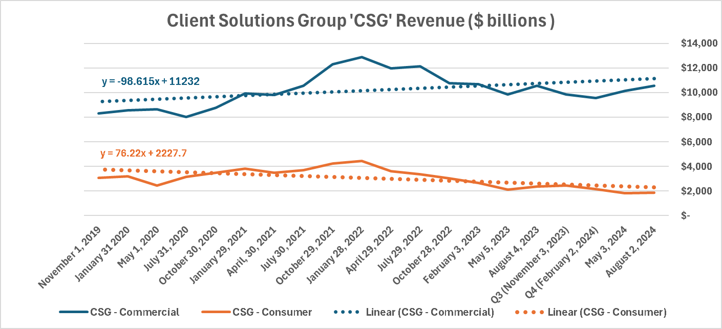 CSG is further divided into Commercial and Consumer sub-segments. What we’ve seen in recent periods is a decline in the consumer segment as the higher cost of living weighs down on people’s purchasing power. Think higher bills, mortgage, and grocery bills. The commercial CSG sales are also off their peaks.
