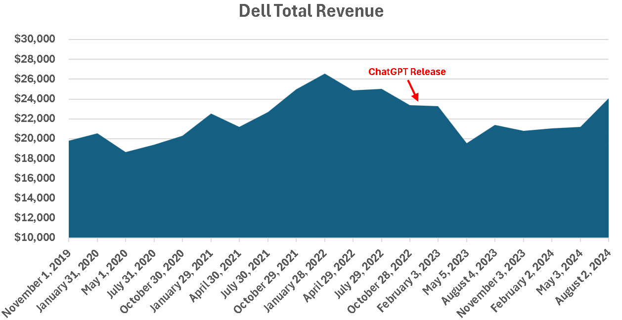 Given Dell’s fluctuating sales in the past few quarters, retail investors might jump to conclusions about Dell’s ability to capitalize on the Data Center AI boom that began in late 2022 with the rollout of OpenAI’s ChatGPT.