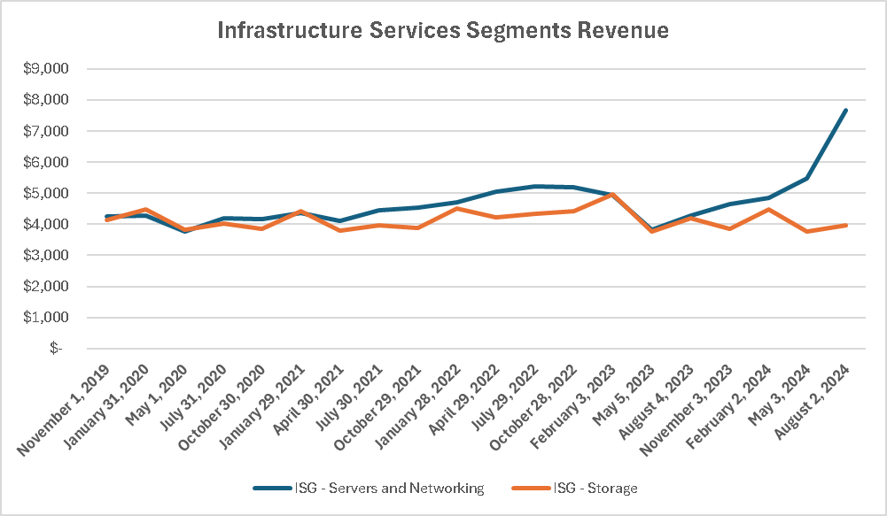 But when we look closer at the Infrastructure Services Group ‘ISG’ segment sales, a much more encouraging picture emerges. The chart below shows the sales of ISG’s two sub-segments; ISG-Storage and ISG-Servers and Networking. The latter includes sales of NVIDIA-powered servers.