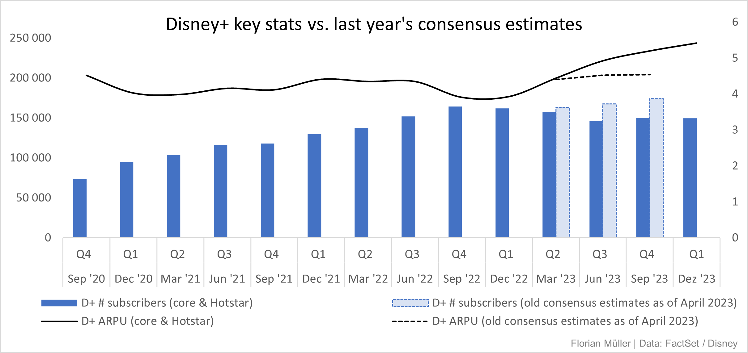 Disney+ has recently come close to finally turning profitable. Besides cost-cutting measures, this can be attributed to rising ARPU, which Iger prioritized over subscriber growth. The move toward profitability was well-received by shareholders. The chart below clearly shows that ARPU has been increased much more aggressively than analysts had expected a year ago, while user numbers have seen contraction or stagnation instead of growth. A positive note is that the decline appears to have reached a bottom, despite continued ARPU increases, leading me to expect rising subscriber numbers again, not least partly attributable to the Swift effect.