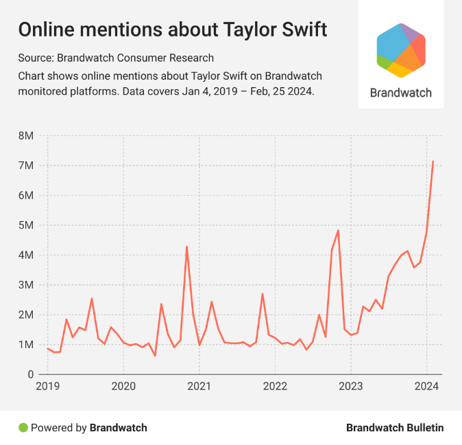 With some highlighting a cost-of-living crisis, all of this suggests that “Panem et Circenses” might be a good strategy in different economic and political environments. While some question whether the world has had enough of Taylor Swift by now, the following chart seems to suggest otherwise. Not to mention Swift’s recent 11th album release, “The Tortured Poets Department,” which shattered record after record in the shortest amount of time for a new album. I won’t go into detail, but with about 1 billion total streams within one week after release, it is already the most streamed album ever. And so, the end of the flagpole doesn’t necessarily seem to have been reached.