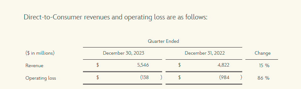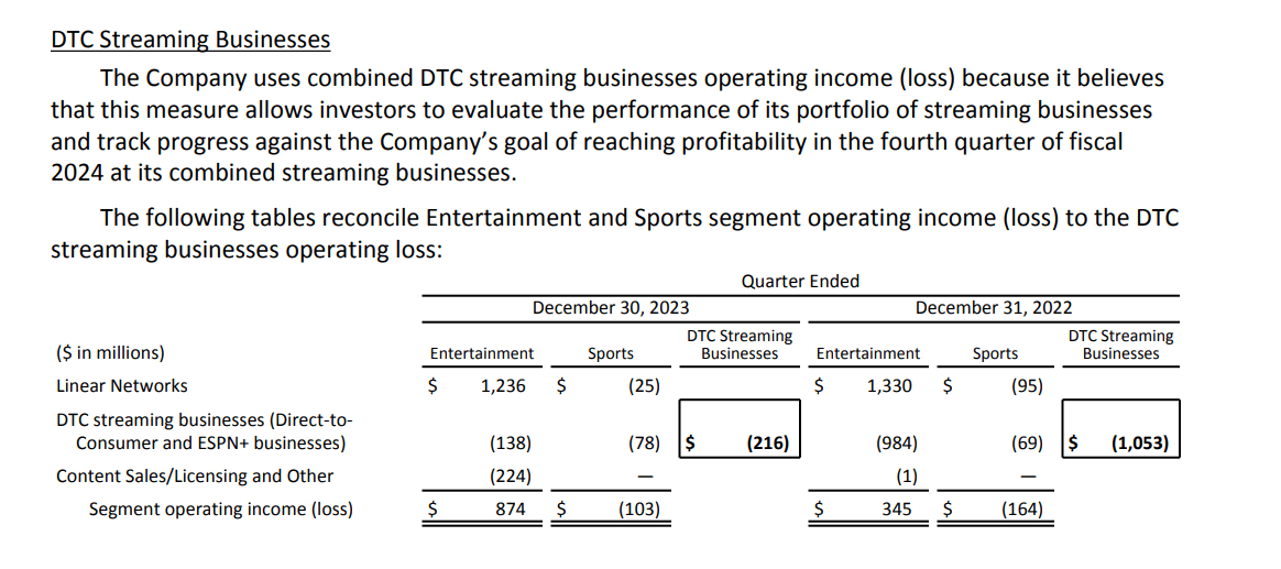 Disney Combined Streaming, Linear Networks, and Other Results (Disney First Quarter 2024, Earnings Press Release)