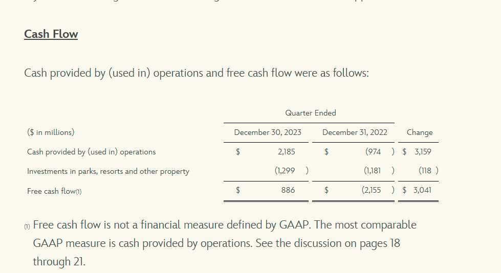 Disney Free Cash Flow Comparison First Quarter 2024 (Disney First Quarter 2024, Earnings Press Release)
