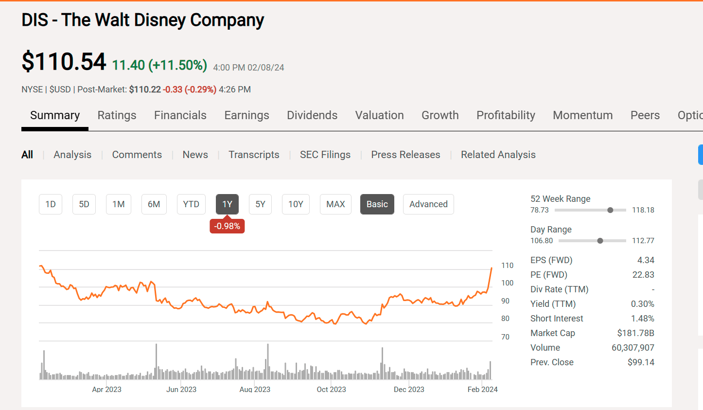 Disney Common Stock Price History And Key Valuation Measures (Seeking Alpha Website February 8, 2024)