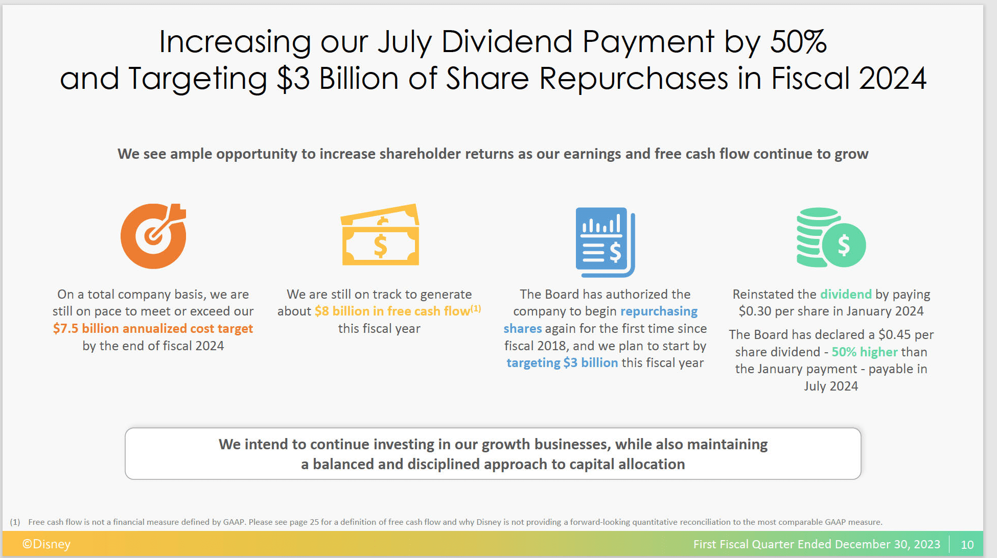 Disney Shareholder Returns And Key Free Cash Flow Goals (Disney First Quarter 2024, Earnings Conference Call Slides)