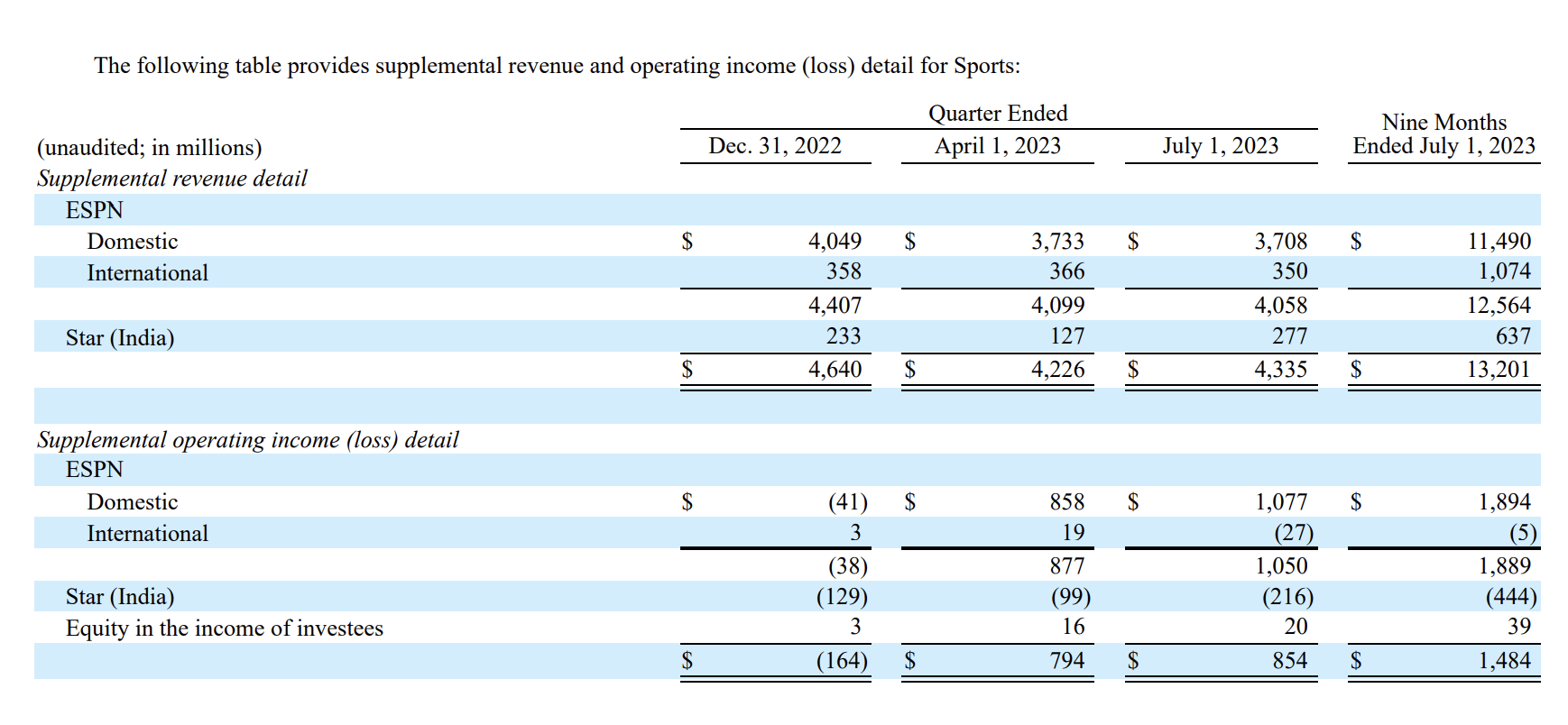 • ESPN’s profits have been a surprising source of revenue for Disney, generating $2.9 billion in operating income in FY22.
