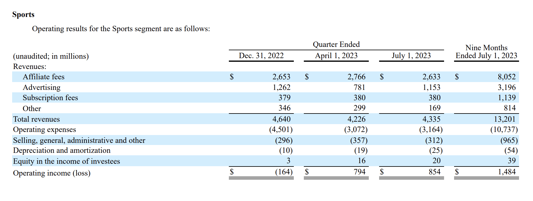 • The reliance on sports programming and affiliate fees highlights the importance of ESPN to Disney’s overall profitability.