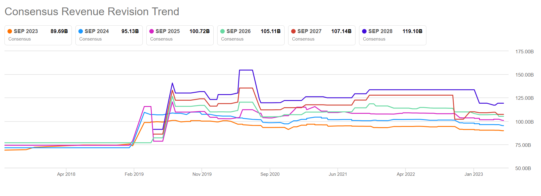 Following the “streaming-push” announcement in early 2019, revenue expectations for Disney have flattened — in fact, slightly deteriorated. Notably, in early 2022 analyst consensus estimated Disney’s FY 2025 revenues at about ~$110 billion; now analysts estimate the same metric to be almost 10% lower, around ~$100 billion.