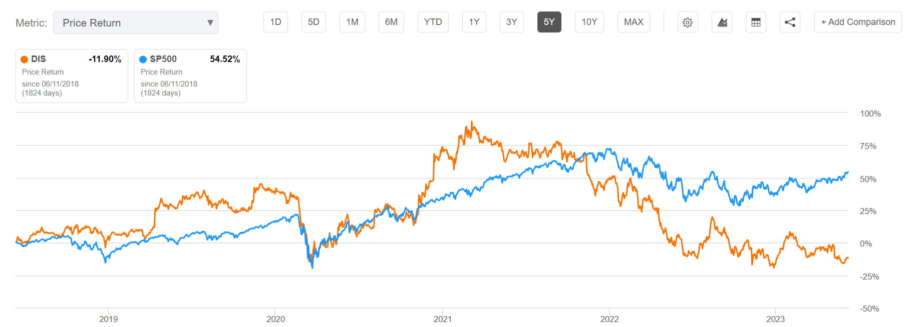 … And referencing the past 5 years, DIS shares are about 12% under water, versus a gain of 54% for the S&P 500 respectively.