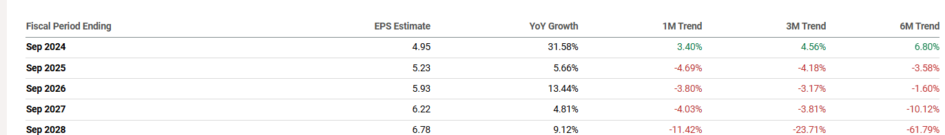 So what’s wrong? Why are we sticking with a hold? Well, there are two reasons here. The first being that while the front end kept upgrades, the back end is being taken to the cleaners. You can see that by the change in earnings estimates for Fiscal 2024 and the change in earnings for Fiscal 2025 and beyond.