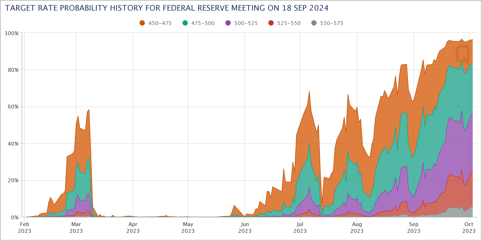 The market is now putting a >90% probability on a >4.50% Federal Funds rate 12 months from now. In August, that number was close to 60%. In the first half of this year, it was 0%.