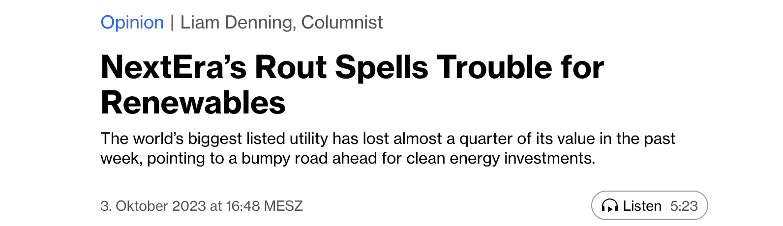There’s also the reason given for NextEra Energy Partners’ problems: Higher interest rates. Renewables projects are especially sensitive to higher yields because of their upfront investment and because the revenue stream on multi-year power supply contracts is akin to long-duration bond coupons. Higher rates are squeezing renewables developers in general, with this year’s wave of contract renegotiations for offshore wind projects being the most high-profile example – until now, anyway.