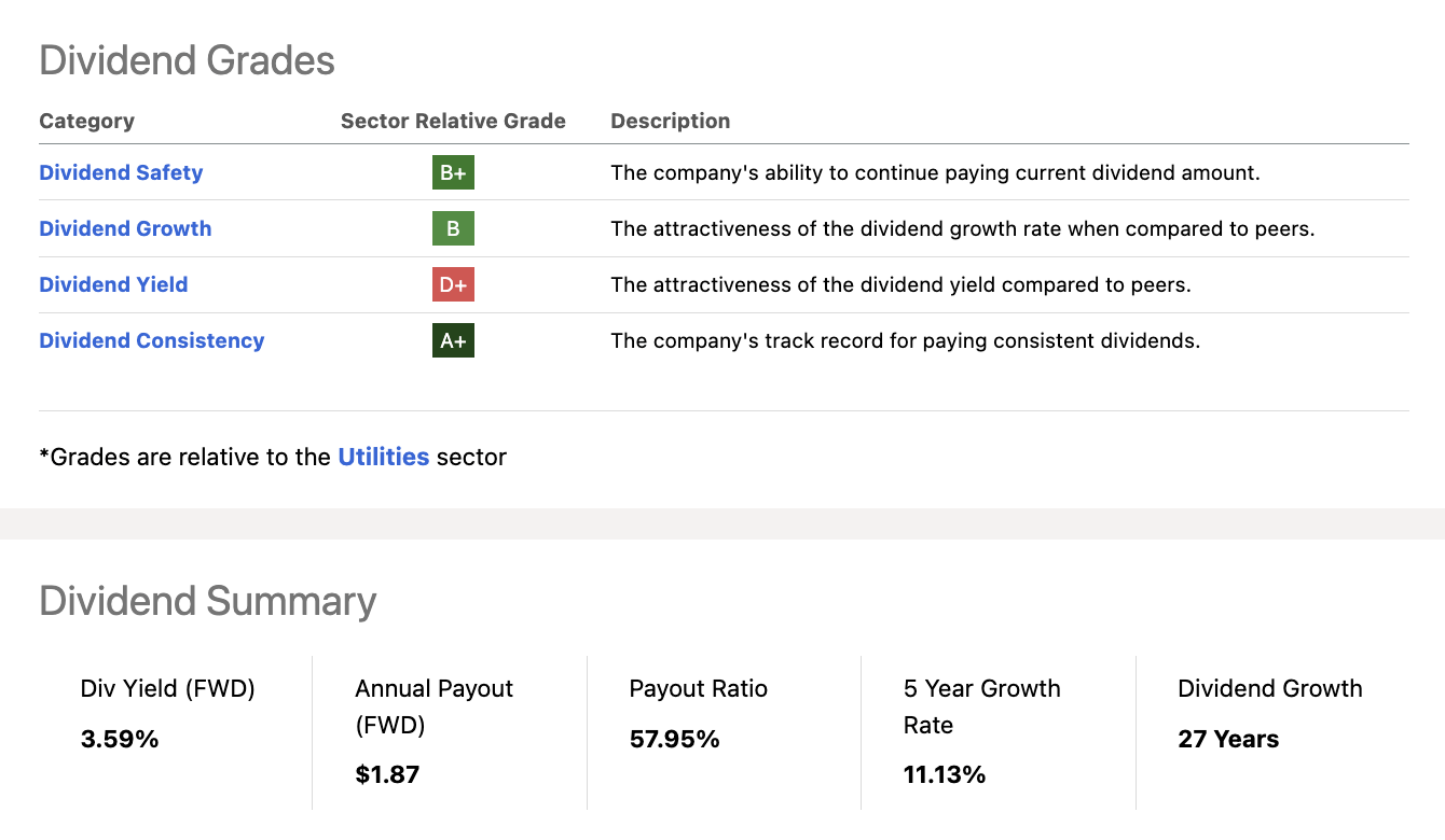 The current dividend yield is 3.6%, backed by a 58% payout ratio and the strong (aforementioned) dividend growth outlook. The company also has dividend aristocrat status and an A+ score for consistency on Seeking Alpha’s dividend scorecard.