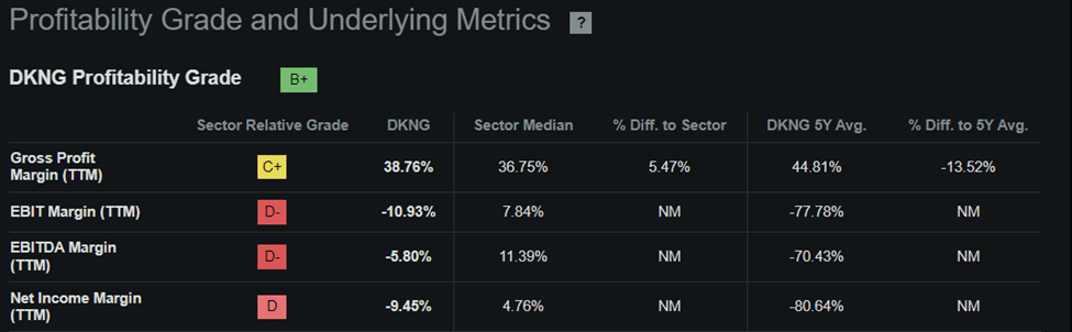 • Despite a positive net income, DKNG is still operationally unprofitable due to high sales and marketing expenses.