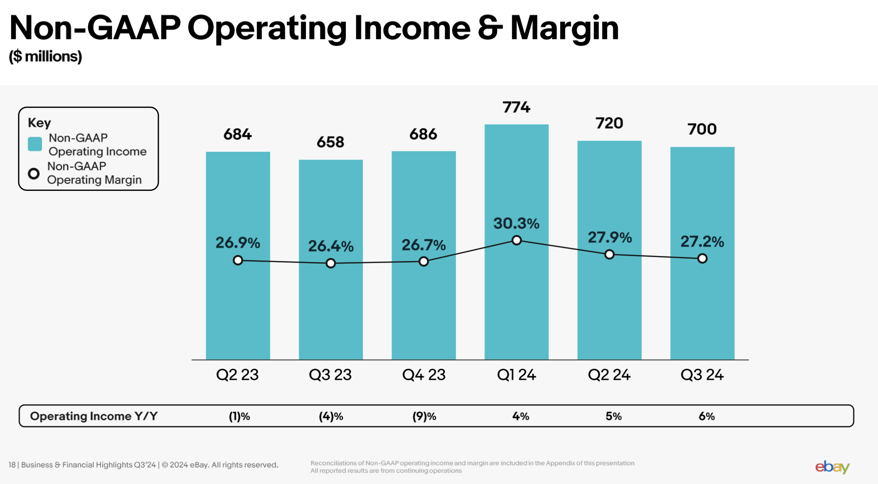 On the profitability side, eBay also boosted its pro forma operating margins by 80bps y/y to 27.2%. Raw operating profit dollars, meanwhile, rose 6.3% y/y to $700 million, as shown in the chart below: