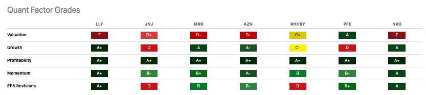 Eli Lilly’s stock returns have significantly outperformed those of its peers, even edging out Novo Nordisk (NVO) by a 1Y return of 96% versus 79%. Both LLY and NVO score “F” on valuation. For example, LLY’s EV/Sales [TTM] of 23.56 is 4.1x that of Merck’s (MRK) 5.74. However, LLY’s revenue growth (YoY) of 29.76% outperforms MRK’s 6.11% (4.8x). To me, statistics like this make LLY’s valuation easier to stomach. LLY’s growth profit margin of 80.16% bests Roche’s (OTCQX:RHHBY) 74.19% but trails AstraZeneca’s (AZN) 82.5%.
