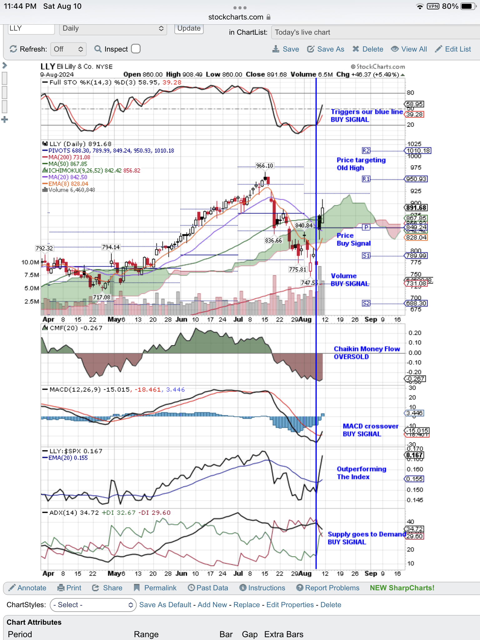 LLY has all our technical Buy Signals and the bounce is targeting the old high (StockCharts.com)