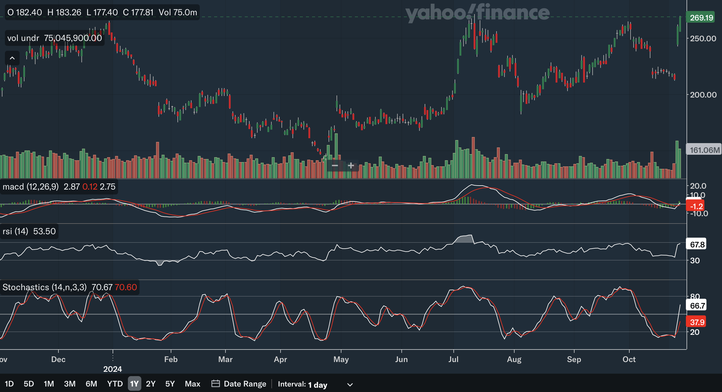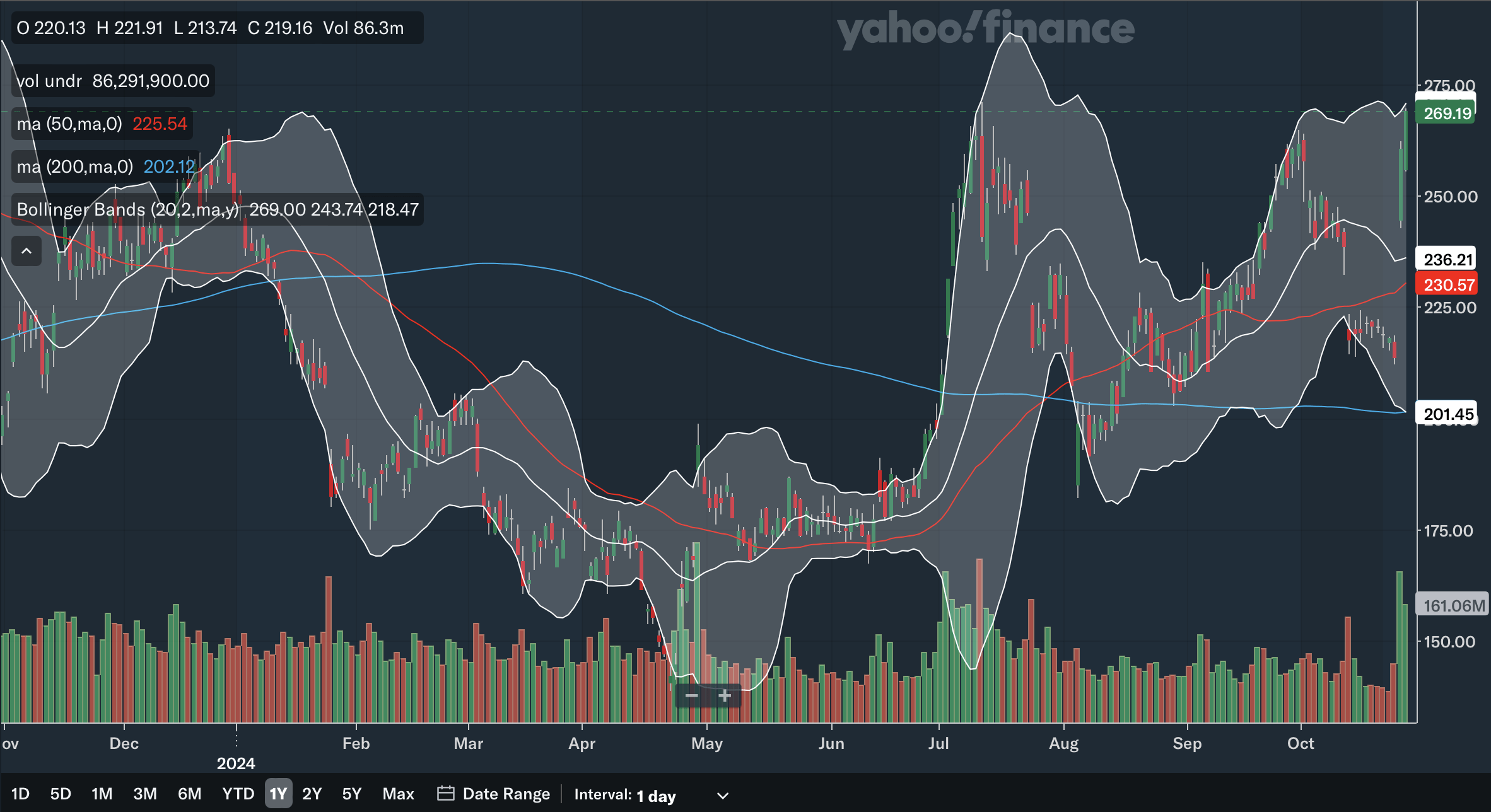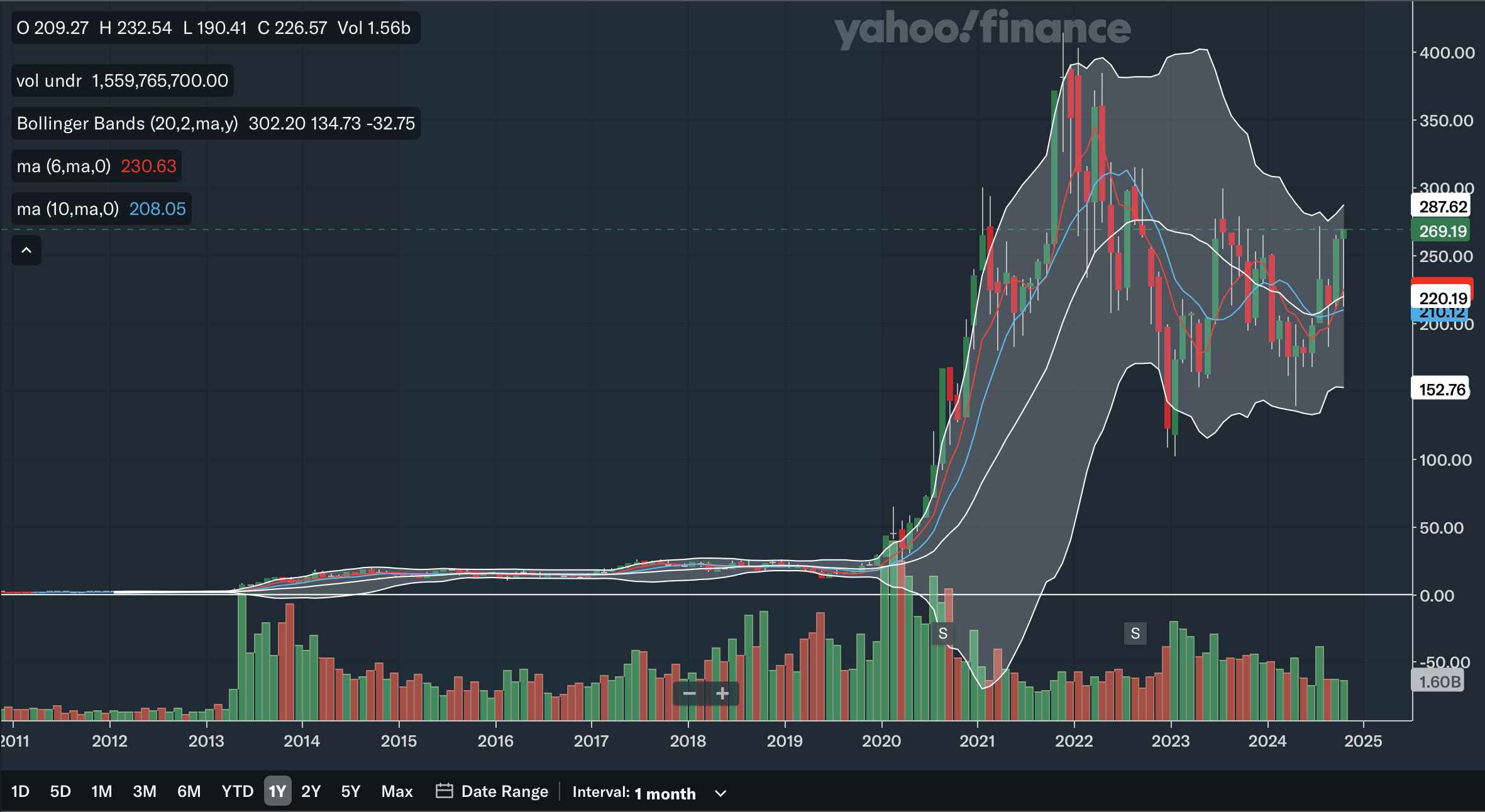 The 6-month SMA recently crossed above the 10-month SMA, which is a bullish signal. The gap is also rapidly widening as the 6-month SMA is on a steep trajectory, showing strong bullish momentum. Again, the stock is trading quite far above the SMAs with the 6-month SMA providing support at only around 220. For the Bollinger Bands, the stock has not hit the upper band, showing it is not yet overbought in the long term and has room to run. Earlier in the year, the stock also reclaimed the 20-month midline, which is another positive development. After trending down since 2022, the midline has also turned up and could be a source of support moving forward. Overall, from my analysis, the long term SMAs and Bollinger Bands are positive as there are multiple bullish indications here.