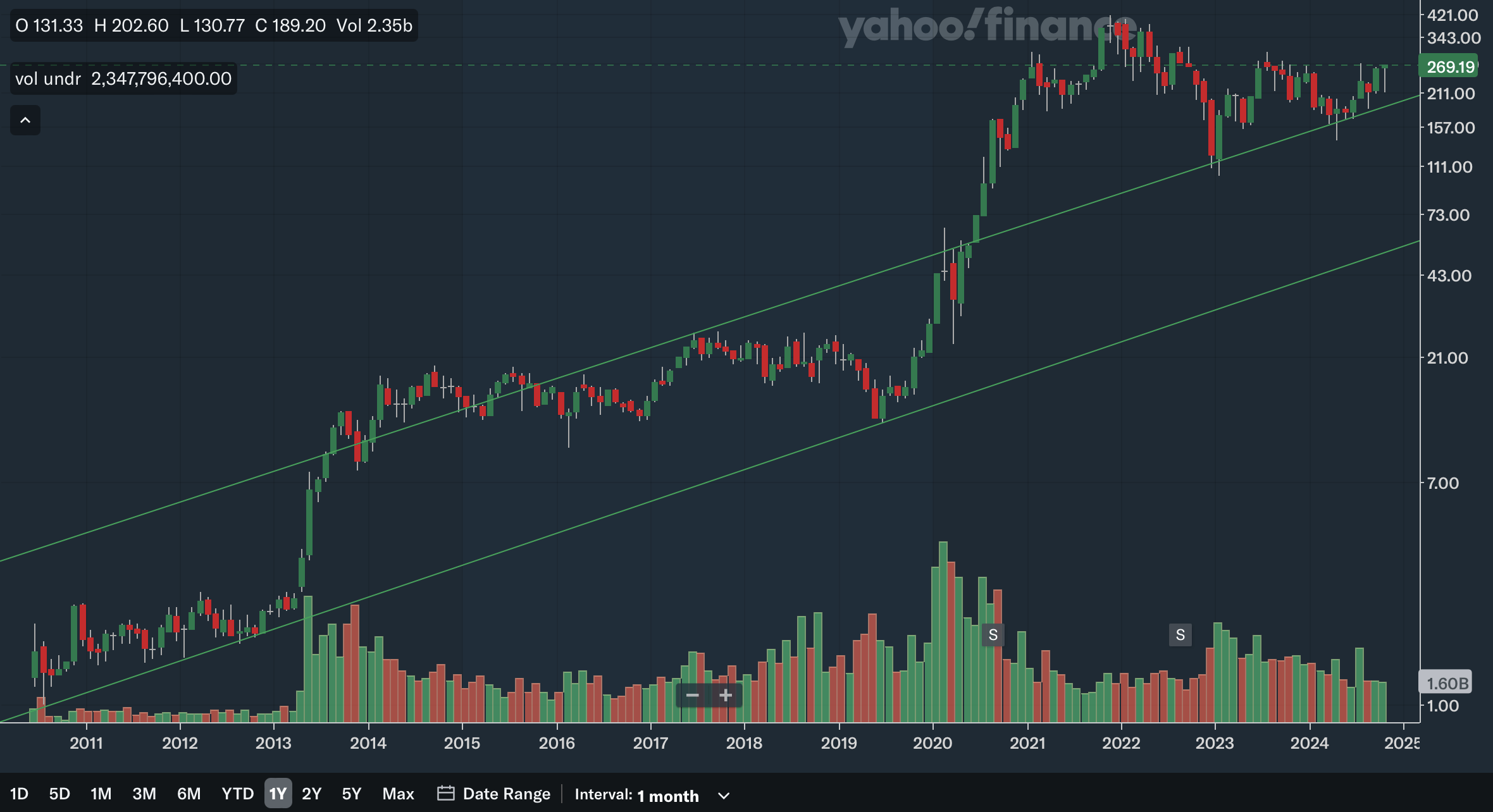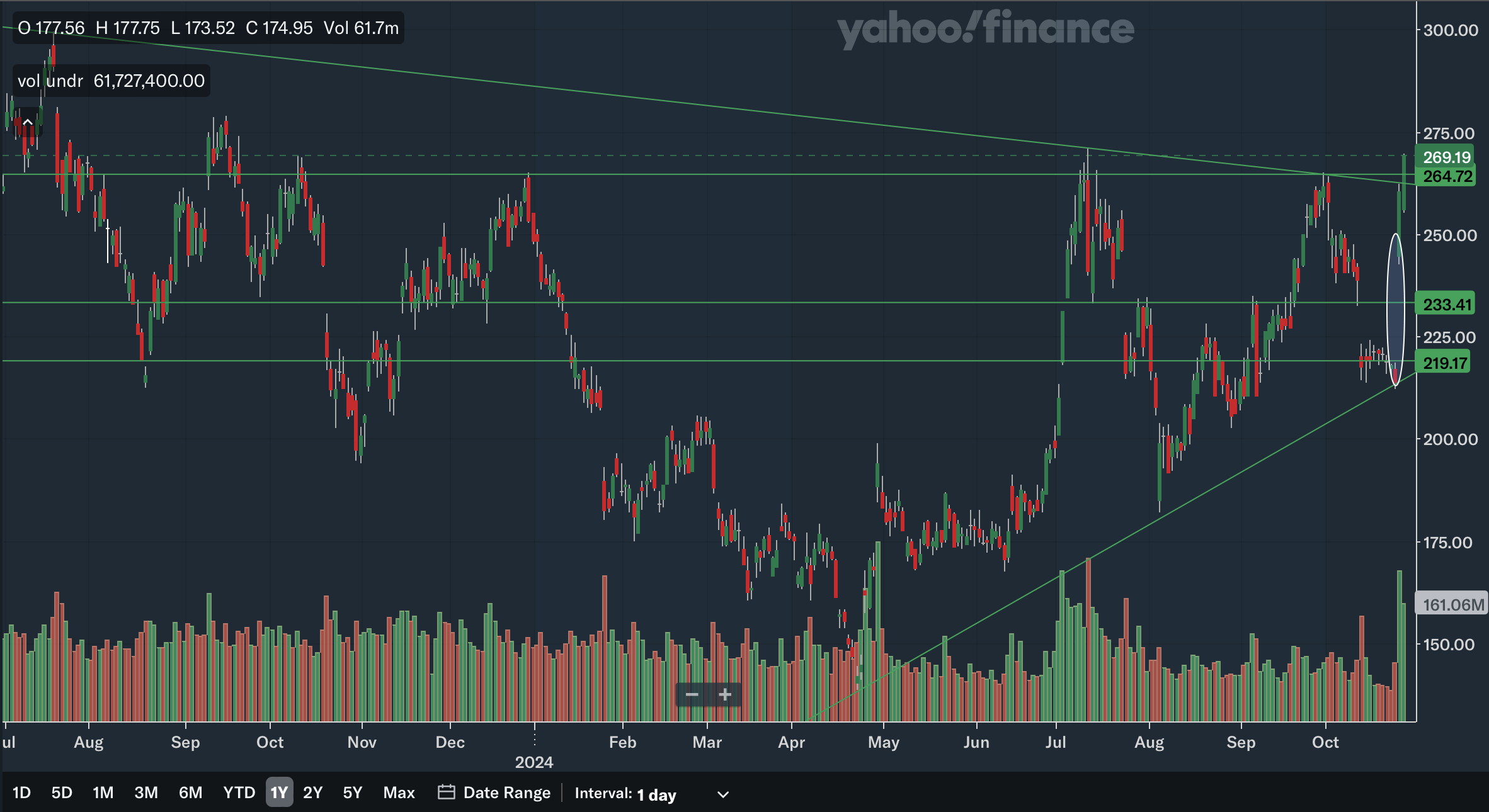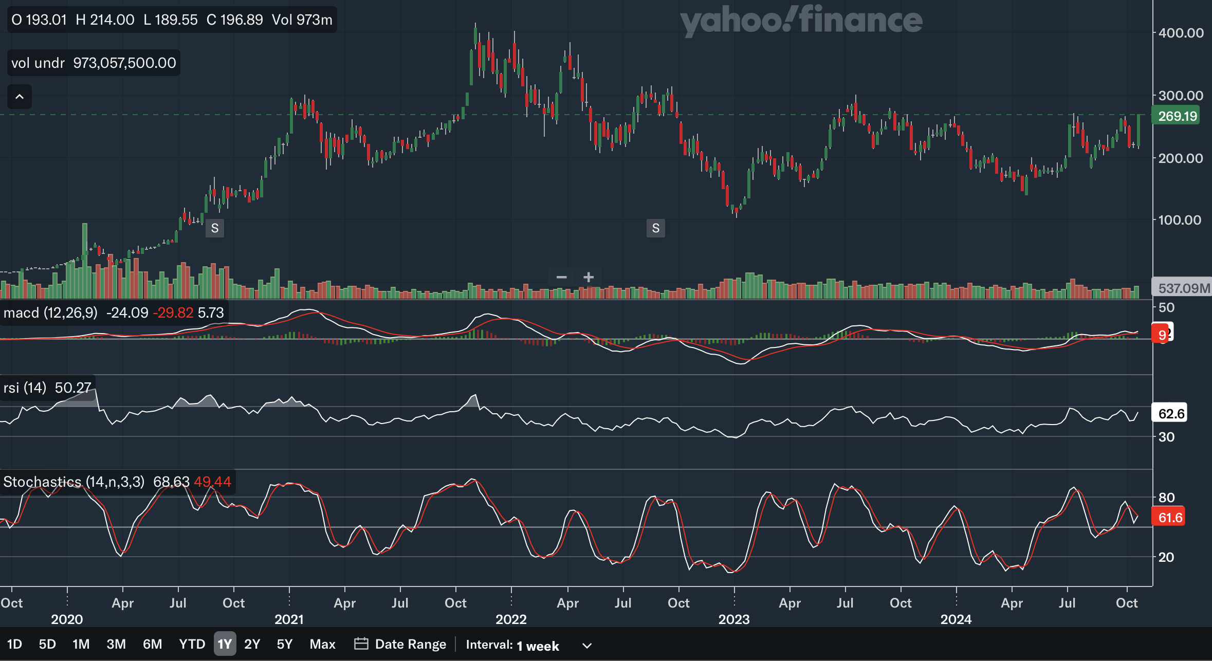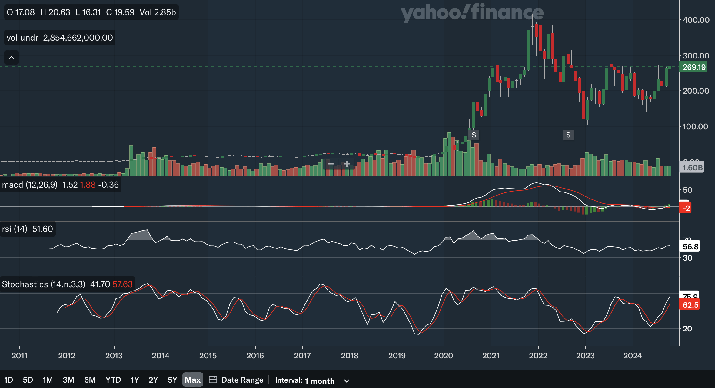 The 6-month SMA recently crossed above the 10-month SMA, which is a bullish signal. The gap is also rapidly widening as the 6-month SMA is on a steep trajectory, showing strong bullish momentum. Again, the stock is trading quite far above the SMAs with the 6-month SMA providing support at only around 220. For the Bollinger Bands, the stock has not hit the upper band, showing it is not yet overbought in the long term and has room to run. Earlier in the year, the stock also reclaimed the 20-month midline, which is another positive development. After trending down since 2022, the midline has also turned up and could be a source of support moving forward. Overall, from my analysis, the long term SMAs and Bollinger Bands are positive as there are multiple bullish indications here.
