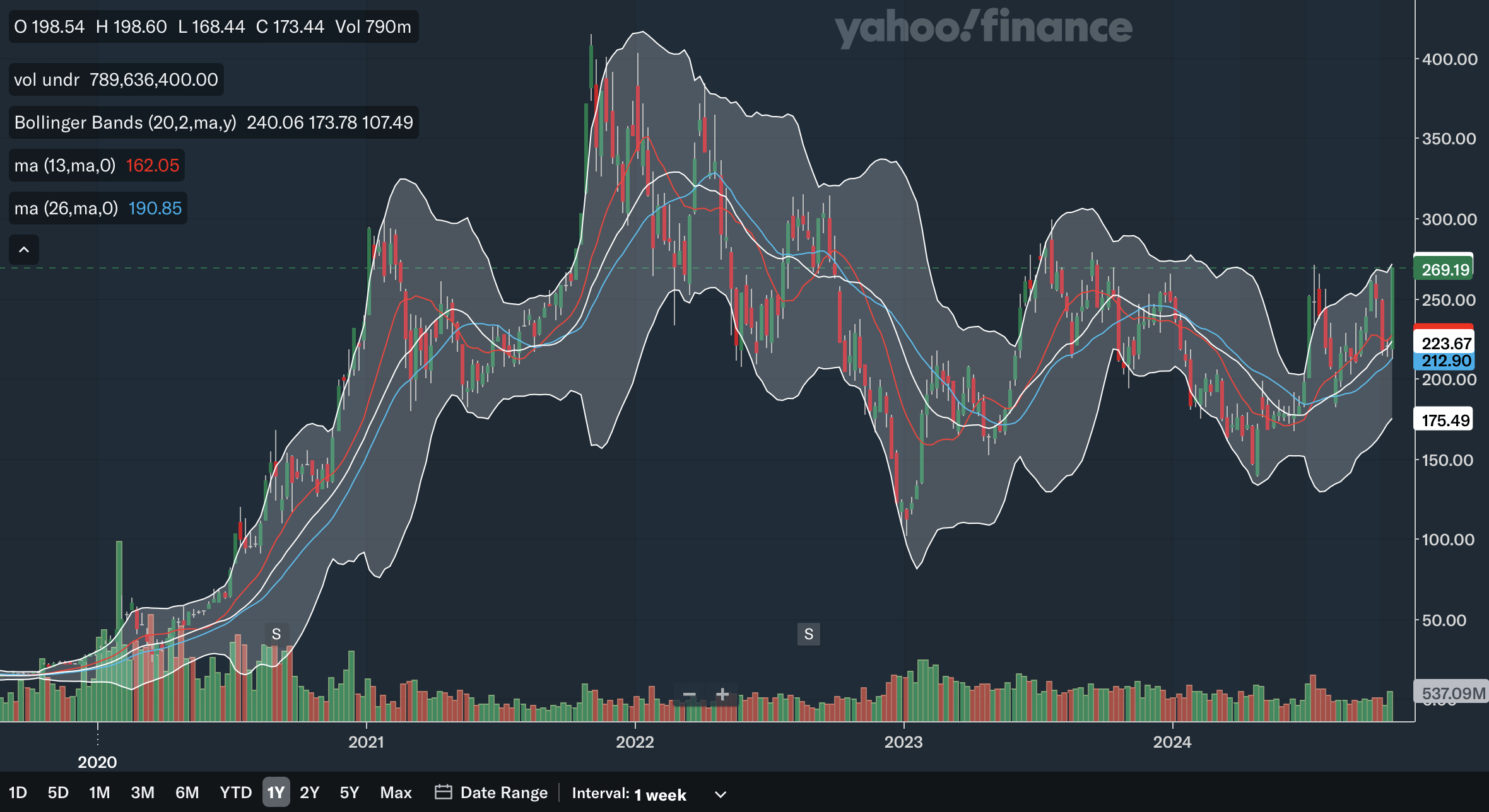The 13-week SMA and the 26-week SMA had a bullish crossover earlier this year. After the gap between the two briefly narrowed, the 13-week SMA has regained its upward trajectory, showing that the bulls are resilient, and it is likely to pull away from the 26-week SMA again in the near future. The stock is also trading far above these weekly SMAs. For the Bollinger Bands, the stock is once again at the upper band, potentially indicating it is overbought. Note that the 20-week midline has held as support since earlier in the year, showing that the stock could be in an intermediate term uptrend. From my analysis, the SMAs and Bollinger Bands confirm the intermediate term chart’s positive outlook for Tesla stock.