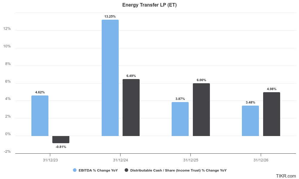 Therefore, Energy Transfer’s solid portfolio seems well-positioned to capitalize on the long-term electricity demand growth prospects attributed to the AI surge. Wall Street estimates suggest a relatively stable adjusted EBITDA growth over the next two years. Hence, it should provide clarity over ET’s distributable cash flow per share, underpinning its attractive distribution yield.