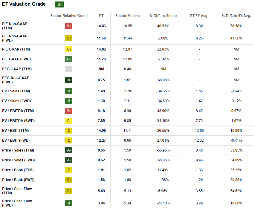 The stock rallied by 25% over the last twelve months, the performance is almost identical with the broader U.S. market. YTD performance is also very strong with an 18% rally. ET has a solid “B+” valuation grade from Seeking Alpha Quant as most of the ratios look attractive compared to the sector median and historical averages.
